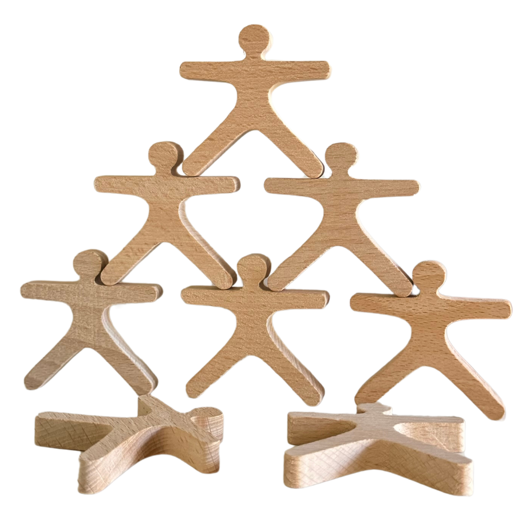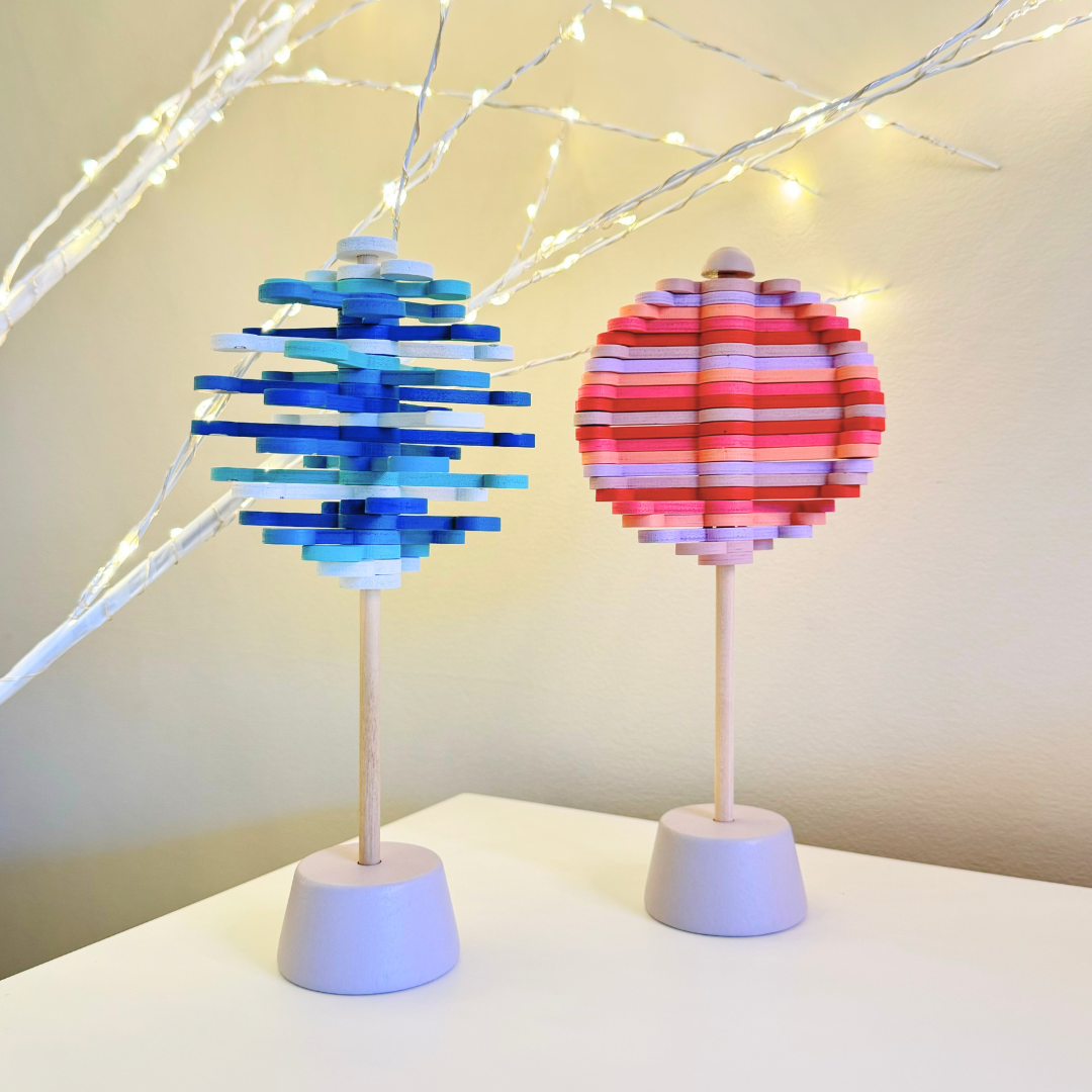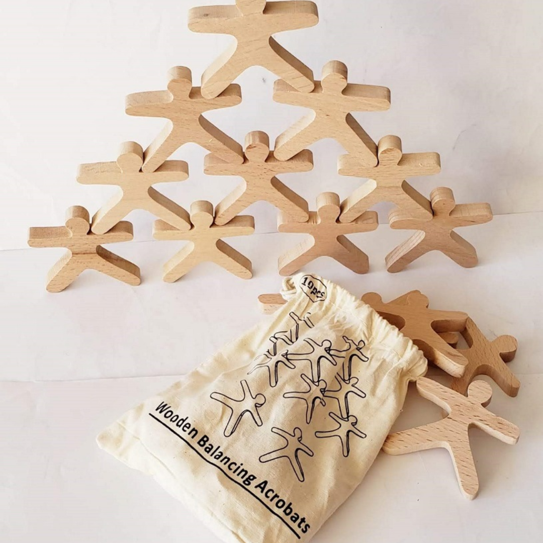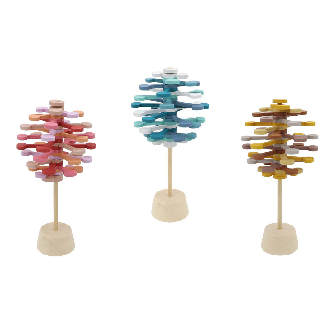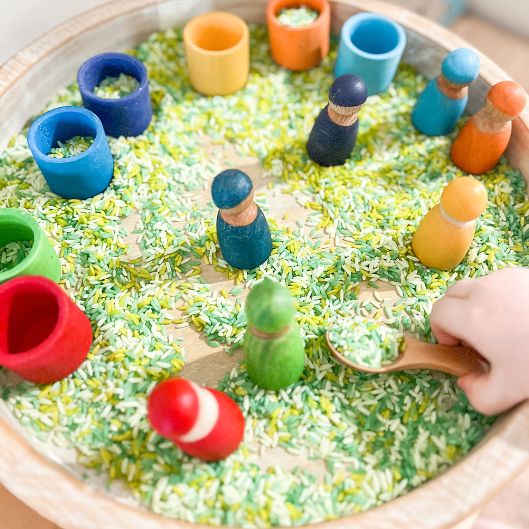 Spin wooden tops to practice wrist control and timing. Use wooden nuts and bolts sets for pinch strength and two-hand work. Try sensory rice or water beads in a tray for scooping and pouring, and add Jellystone play trays to keep everything contained. Balance and stacking games train careful placement and planning, and ring toss adds graded force and aim. Mix two or three so your child can switch tasks without losing focus.